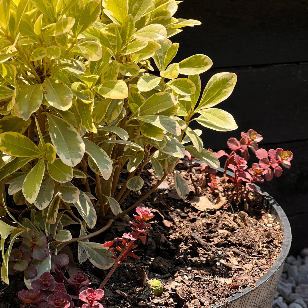 El follaje variegado aporta luz y presencia, mientras que el Sedum rojo cubre la superficie del sustrato con un contraste cálido y moderno, creando una composición equilibrada y armónica durante todo el año.